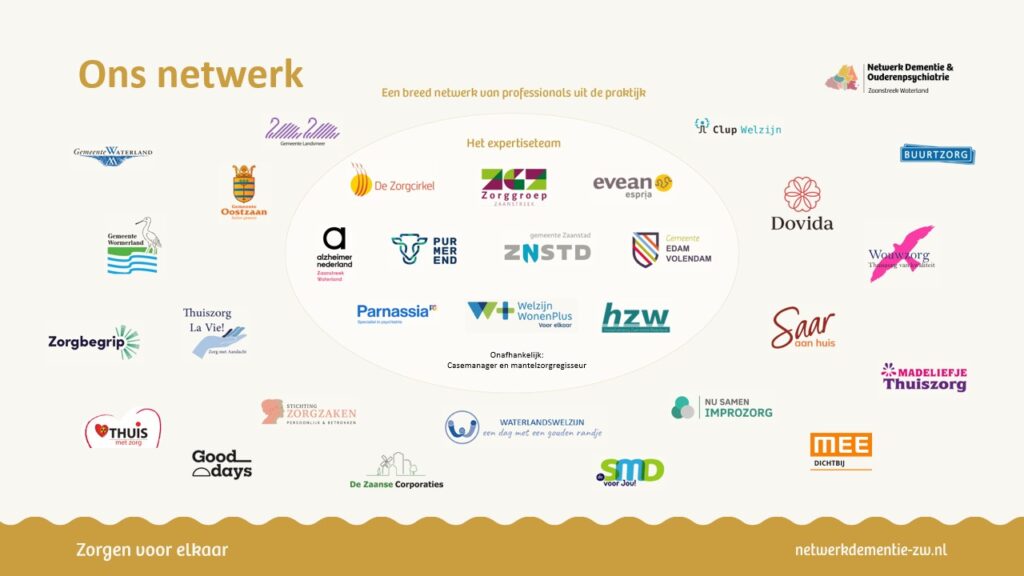Zorgen voor elkaar. Ons regionale netwerk is er voor iedereen die te maken heeft met dementie en psychische kwetsbaarheden. Specifiek voor inwoners in onze regio Zaanstreek Waterland.